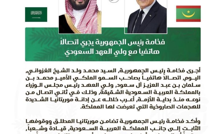 أجرى فخامة رئيس الجمهورية، السيد محمد ولد الشيخ الغزواني، اليوم، اتصالًا هاتفيًا بصاحب السمو الملكي الأمير محمد بن سلمان بن عبد العزيز آل سعود، ولي العهد رئيس مجلس الوزراء بالمملكة العربية السعودية الشقيقة، وذلك في ثاني اتصال من نوعه منذ بداية الأزمة، أعرب خلاله عن إدانة موريتانيا الشديدة للهجمات الصاروخية التي تعرضت لها المملكة.